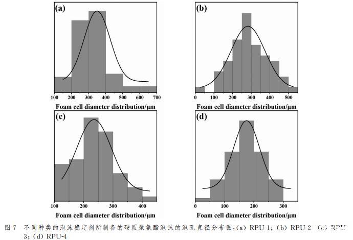 為了對(duì)聚氨酯泡沫孔徑大小和分布情況進(jìn)行量化,通過ImageJ軟件對(duì)SEM測(cè)試結(jié)果進(jìn)行處理分析,其孔徑分布直方圖如圖7所示。通過泡沫的孔徑分布直方圖對(duì)比結(jié)果可以看出,添加國產(chǎn)-1的聚氨酯泡沫孔徑分布范圍在100~700μm,存在較大直徑的泡孔,添加進(jìn)口-2的聚氨酯泡沫泡孔直徑分布范圍在0~550μm,雖然分布范圍有變窄,但也存在較大泡孔直徑,添加PAVE-5的聚氨酯泡沫泡孔直徑分布范圍在100~450μm,泡孔分布范圍減小,但仍然存在超過400μm的大泡孔,分布范圍最窄的是添加PGVF-6泡沫穩(wěn)定劑的硬質(zhì)聚氨酯泡沫,分布范圍在0~300μm,沒有超過400μm直徑的泡孔,泡沫泡孔直徑得以減小,泡沫泡孔細(xì)小均勻。這種微觀結(jié)構(gòu)上的改善可能得益于在發(fā)泡過程中,接枝APEG的POSS可以作為三維網(wǎng)絡(luò)結(jié)構(gòu)的交聯(lián)點(diǎn),通過其與聚氨酯基體的相容性,親水性-OH基團(tuán)有助于形成更加穩(wěn)定的泡沫結(jié)構(gòu)。