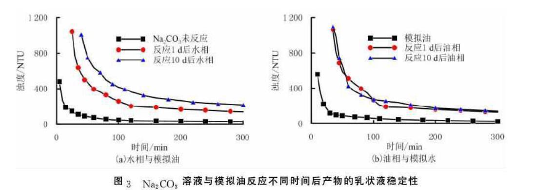 圖3 Na2CO3溶液與模擬油反應(yīng)不同時(shí)間后產(chǎn)物的乳狀液穩(wěn)定性