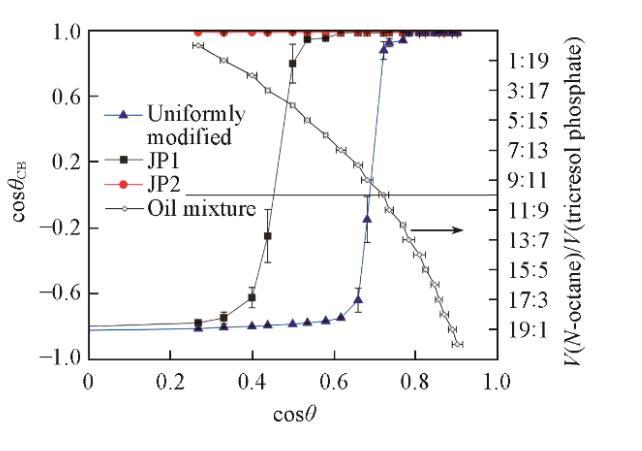 放置在靜止液體表面的顆粒的潤(rùn)濕行為由圖5示出。隨著液體表面張力的增加,從光滑的氟碳鏈覆蓋的表面獲得的cosθ值同時(shí)增大,液體頂部的表面出現(xiàn)明顯的不溶顆粒。這種顆粒不潤(rùn)濕的情況與顆粒形成粗糙表面測(cè)量的結(jié)果具有相關(guān)性。干燥的顆粒以蓬松狀態(tài)直接向油相傾倒,如果在油相表面能形成足夠強(qiáng)壯的、由顆粒組成的亞穩(wěn)態(tài)Cassie-Baxter狀態(tài),那么疏油表面將會(huì)形成,并阻止其它顆粒接觸油相,宏觀表現(xiàn)為顆粒不潤(rùn)濕。相反,如果油相表面由顆粒組成的亞穩(wěn)態(tài)Cassie-Baxter狀態(tài)魯棒性不足,在手動(dòng)振蕩或重力作用下,顆?;蝾w粒團(tuán)聚體接觸油相并浸沒(méi)在油相中。亞穩(wěn)態(tài)魯棒性與顆粒表面材料潤(rùn)濕角密切相關(guān),即不同類型的顆粒具有明顯不同的潤(rùn)濕轉(zhuǎn)折點(diǎn)。JP1潤(rùn)濕性轉(zhuǎn)折點(diǎn)位于均勻修飾顆粒右側(cè),JP2沒(méi)有發(fā)現(xiàn)潤(rùn)濕轉(zhuǎn)折點(diǎn)。這與顆粒上接枝的烷烴鏈數(shù)量有關(guān)。JP2上盡管存在氟碳鏈,但由于烷烴鏈覆蓋的面積太大,使顆粒整體表現(xiàn)出強(qiáng)烈的親油性。