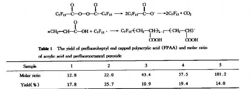 聚合反應是在溶劑CF_{2}CICF CI_{2}中進行的,大自由基將進行鏈轉移,單基或雙基終止反應,從而得出產(chǎn)物。反應步驟為在-17℃溫度下將50mL含有預定摩爾的全氟庚雙酰過氧化物的CF?CICFCI?溶液加入有氮氣保護裝置的反應器中,攪拌下加入已精制過的丙烯酸(密度1.0511g/mL),加熱并恒溫在45℃下反應10h,產(chǎn)物通過甲醇-乙酸乙酯溶劑體系重結晶并置真空烘箱中干燥,稱重并計算產(chǎn)率(如表1)。