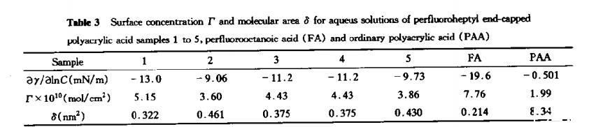 由表3可見,聚丙烯酸(分子量2.5x10?)在水溶液中界面活性極低(數(shù)據(jù)引自文獻),每個PAA分子對空氣-水界面的覆蓋十分松散,全氟庚酸分子所占約0.21nm2,接近全氟烷烴緊密排列的分子軸截面積,而FPAA每個分子所占據(jù)的表面面積在0.32~0.46nm2之間,形成尾形鏈構象的刷狀結構。全氟端基的引入,顯著改變了PAA分子在界面的構象,由于全氟烴的憎水特性,在水溶液中趨于向水空氣界面的吸附,從而極大的提高了界面活性,降低了界面能。