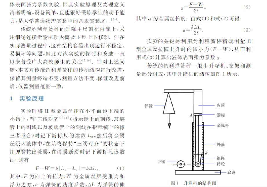 約利彈簧秤是一種精細(xì)彈簧秤,常用來測定微小的力。利用約利彈簧秤采用拉脫法測量液體表面張力系數(shù)實(shí)驗(yàn),因其實(shí)驗(yàn)原理及物理意義清晰明確,設(shè)備簡單,且能很好鍛煉學(xué)生的動(dòng)手能力,是大學(xué)普通物理實(shí)驗(yàn)中的常規(guī)實(shí)驗(yàn)之一。