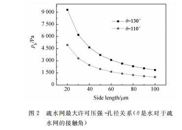 其中:sigma為液體表面張力,a為柵網(wǎng)方孔的邊長,theta為液體對于柵網(wǎng)的接觸角。計(jì)算中假設(shè)水溫為20^{circ}C,此時水的表面張力系數(shù)sigma=0.0728~N/m(后面計(jì)算中都采用此參數(shù))。最大許可壓強(qiáng)Pb和孔邊長的關(guān)系如圖2所示,可以看到采用疏水性好、網(wǎng)孔小的柵網(wǎng)可以得到更大的Pb。