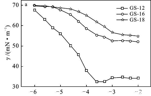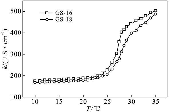 2.2.1 Krafft溫度Krafft溫度影響表面活性劑溶解度,表面活性劑在此溫度以上可以形成膠束。在Krafft溫度以下,以單分散的表面活性劑與水化固體表面活性劑的狀態(tài)存在,而在Krafft溫度以上,水化固體表面活性劑的溶解和膠束形成也參與了平衡[9-10]。質(zhì)量分數(shù)1%表面活性劑GS-12,在室溫可以完全溶解,將其溶液置于冰水混合物中1周,溶液仍然澄清透明,沒有渾濁的跡象。表明GS-12的Krafft溫度低于0℃。通過測量電導率可以得到Krafft溫度的近似值,由圖3可知,GS-16,GS-18的Krafft溫度分別為27,27.5℃。k值在較低溫度下緩慢增加,這是由于離子表面活性劑的溶解度有限。隨著溫度的進一步升高,Krafft溫度處的k值急劇增加。k值的增加是由于膠束的形成,水合表面活性劑的溶解度突然增加,直至達到克拉夫特溫度。此外,離子遷移率增加隨著溫度增加、k逐漸增加[3,10]。結(jié)果表明,Gemini表面活性劑的Krafft溫度隨表面活性劑的疏水鏈長的增加而升高。