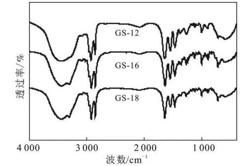 根據(jù)方案1的合成路線,成功制備了3種以1,4-二溴-2-丁烯為連接基團的酰胺基Gemini表面活性劑。利用紅外和核磁對酰胺基Gemini表面活性劑GS-12,GS-16,GS-18進行結(jié)構(gòu)表征,結(jié)果見圖1和圖2。