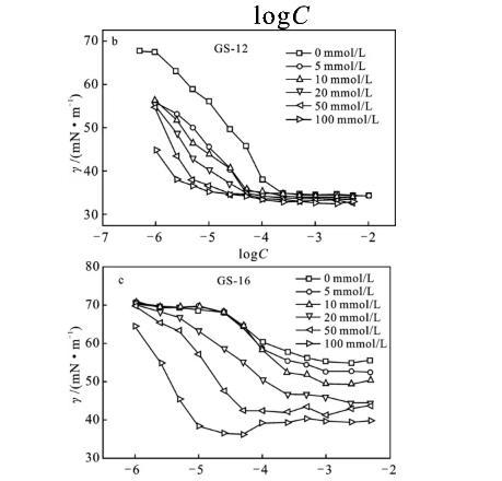 表面張力測量是研究表面活性劑CMC值的一種有效方法。濃度的增加降低了溶液的表面張力,然后達到一個恒定值,則會產(chǎn)生一個明確的轉(zhuǎn)折點,表明膠束化的開始。在CMC之下,表面活性劑分子排布于空氣/水界面上來降低表面張力。在CMC以上,外加表面活性劑單體,當表面活性劑單體充分填充表面時,更傾向于與膠束結(jié)合而不是進入界面膜[3,7]。因此,γ與lgC的關(guān)系圖陡然減小,直至達到CMC,并在CMC以上變得相對恒定。圖5為不同的KBr鹽濃度下,陽離子Gemini表面活性劑混合溶液的表面張力圖。