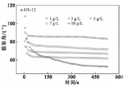 在KBr濃度區(qū)間1~10 g/L內(nèi),GS-12隨著KBr濃度的增加,接觸角顯著減小,而GS-16和GS-18則變化不明顯??梢越忉尀?對于GS-12而言,KBr濃度越高,固/液界面處的填料越緊密,導(dǎo)致氣/液固界面張力值降低,而疏水鏈較長的GS-16和GS-18其自身降低界面張力的能力有限,所以,隨KBr濃度增加,接觸角變化有限[1,19]。此外,隨著KBr濃度的增加,液滴在石蠟?zāi)ど系慕佑|角值減小。
