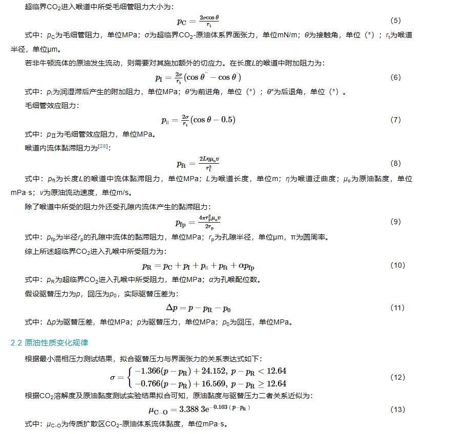 由于各個油藏的實際情況存在差異,因此該模型應用的過程中需要結(jié)合油藏最小混相壓力、喉道尺寸分布公式、驅(qū)替壓力與界面張力的關(guān)系表達式、原油黏度與驅(qū)替壓力的關(guān)系表達式等。