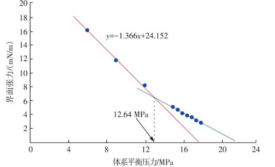 如圖2所示,懸滴法測試結(jié)果表明:當體系平衡壓力<12.64 MPa時,界面張力隨體系平衡壓力的增大而快速減小,其線性擬合的直線與X軸交點位于17.56 MPa,該體系平衡壓力為多級接觸最小混相壓力;當體系平衡壓力≥12.64 MPa時,界面張力減小幅度變緩,線性擬合的直線與X軸交點位于21.63 MPa,代表了CO2與原油一次接觸最小混相壓力。