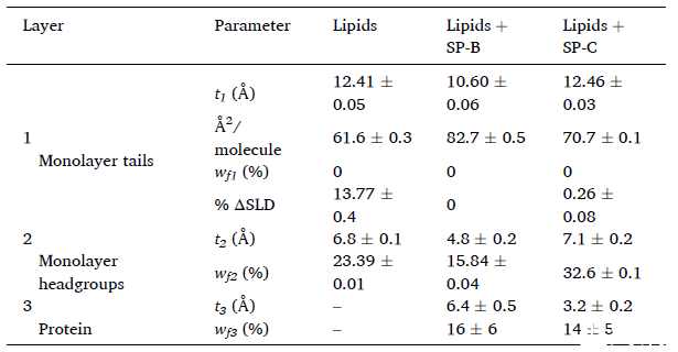 圖5、從35 mN/m處的擬合獲得的結(jié)構(gòu)參數(shù)分別表示每層的厚度和水體積分?jǐn)?shù)。ΔSLD(%)表示擬合SLD與理論SLD值之間的百分比差。