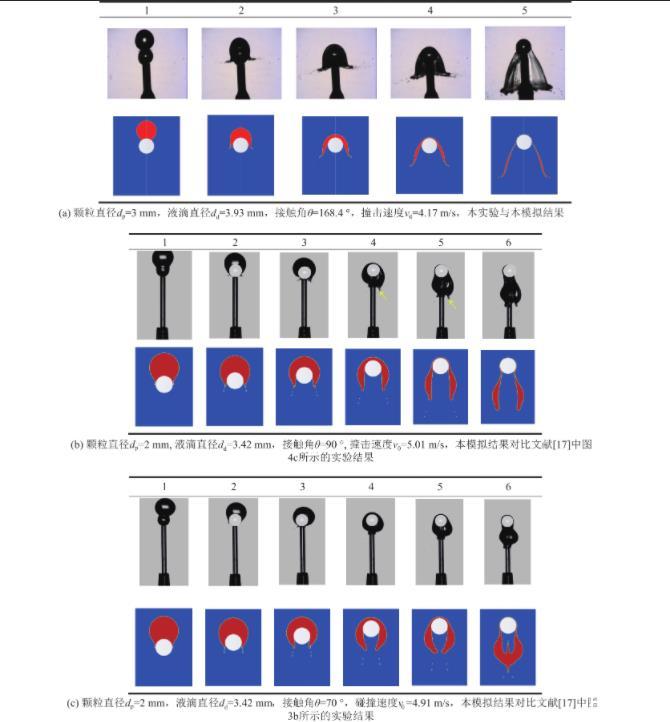 為進(jìn)一步驗(yàn)證本模型計(jì)算結(jié)果的可靠性,依據(jù)BANITABAEI等在實(shí)驗(yàn)中設(shè)置的不同碰撞條件,開(kāi)展了相應(yīng)的數(shù)值模擬。如圖5b和圖5c所示,在不同碰撞條件下,數(shù)值模擬結(jié)果中的液滴形變過(guò)程與實(shí)驗(yàn)結(jié)果均具有較高的吻合度。圖6對(duì)比了數(shù)值模擬結(jié)果與實(shí)驗(yàn)結(jié)果中液滴幾何尺寸的變化過(guò)程,也具有較高的吻合度。其中,圖6a所展示的液膜底部直徑隨時(shí)間變化曲線(xiàn),數(shù)值模擬結(jié)果與實(shí)驗(yàn)結(jié)果稍有偏差,原因是實(shí)驗(yàn)中固定顆粒的支撐柱對(duì)液膜底部的形變過(guò)程產(chǎn)生了一定影響。綜上所述,可認(rèn)為筆者構(gòu)建的數(shù)值模擬模型合理,結(jié)果具有較高可靠性。由于在毫米尺度下和微米尺度下,液滴與固體顆粒的碰撞過(guò)程均遵守經(jīng)典牛頓力學(xué)定律和經(jīng)典流體力學(xué)理論,所以本數(shù)值模擬模型可用于微米尺度下的其他工況條件的數(shù)值模擬研究。