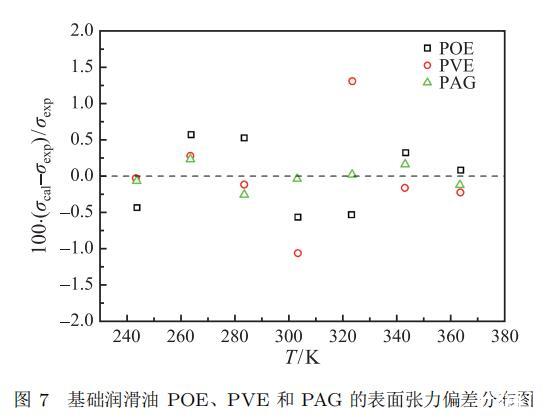 式中,T 是溫度,K;σ 是表面張力,mN·m?1;a、b 和 c 為關(guān)聯(lián)方程的擬合參數(shù)?;A(chǔ)潤滑油 POE、PVE 和 PAG 的參數(shù)關(guān)聯(lián)值和絕對平均偏差列于表 4 中,其實驗數(shù)據(jù)與關(guān)聯(lián)方程的絕對平均偏差分別為 0.43%、0.45% 和 0.13%;三種基礎(chǔ)潤滑油的相對偏差分布如圖 7 所示,其實驗測量結(jié)果的相對偏差均在 ±1.5% 以內(nèi),表明實驗結(jié)果與關(guān)聯(lián)方程的吻合良好。