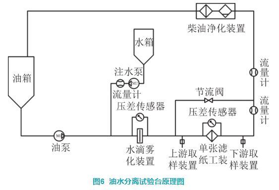 油水分離試驗(yàn)臺(tái)的原理如圖6所示。通過(guò)向水滴霧化裝置上游管路內(nèi)按質(zhì)量比0.15%的比例注水,油水混合物通過(guò)孔板裝置后柴油中的水會(huì)破散成更小的水滴,通過(guò)控制水滴霧化裝置兩端的壓差可以得到不同粒徑分布的水滴,調(diào)節(jié)壓差得到合適粒徑分布的水滴進(jìn)行油水分離效率試驗(yàn)。