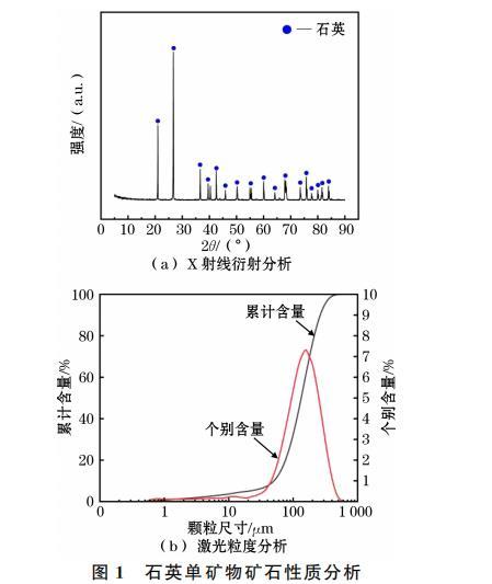 本試驗(yàn)所用的單礦物石英取自某礦廠,將制備后的石英單礦物樣品進(jìn)行X射線衍射(XRD)分析、X射線熒光光譜(XRF)分析和激光粒度分析,XRD的分析結(jié)果如圖1(a)所示,XRF的分析結(jié)果見(jiàn)表1,粒度分析如圖1(b)所示。從圖1(a)可以看出,石英單礦物SiO?峰強(qiáng)度以及密度最高,說(shuō)明SiO?占主導(dǎo)地位。從圖1(b)可以看出,樣品的中值粒徑D??達(dá)到了133.5μm,D??則達(dá)到了264.3μm.綜合上述礦物的純度以及粒度,石英可滿(mǎn)足后續(xù)單礦物試驗(yàn)以及機(jī)理分析的要求。