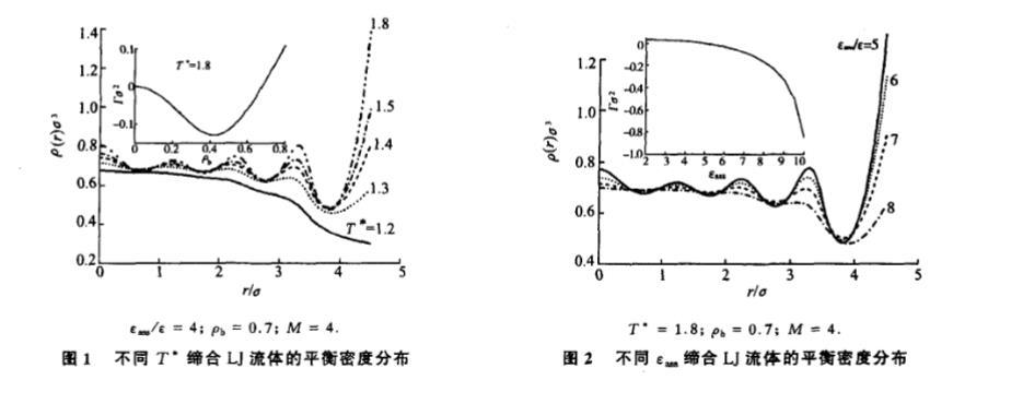 就非均勻體系而言,分子間 的排斥體積作用是使得密度呈振蕩分布的主要原因。然而,圖 1,2 表明 T 和 ε 也在很大程度上影響著體系平衡結(jié)構(gòu)。圖 1 中,密度分布曲線振蕩幅度隨著 T 的降低而衰減,且當(dāng) T=1.2 時(shí),曲線的振蕩趨勢(shì)幾乎完全消失。原因在于 T 越小,分子的無(wú)規(guī)運(yùn)動(dòng)能力越弱,分子間比較容易發(fā) 生締合并形成尺寸較大的團(tuán)簇結(jié)構(gòu)。在平衡態(tài)下,體系的最大構(gòu)象熵要求這些團(tuán)簇結(jié)構(gòu)向體相轉(zhuǎn)移,從而導(dǎo)致密度分布曲線振蕩趨勢(shì)的削弱和接觸密度的降低。然而,一旦增大 T*,分子無(wú)規(guī)運(yùn)動(dòng)能力的增強(qiáng)使得分子間很難形成穩(wěn)定的締合結(jié)構(gòu)。這在某種意義上降低了分子的締合能力,從而使分子間的排斥體積作用在更大程度上決定體系的平衡結(jié)構(gòu)。