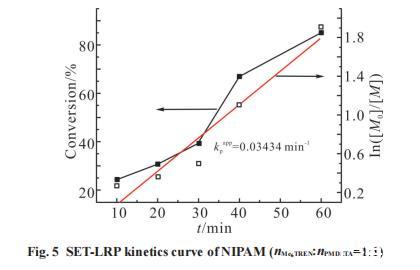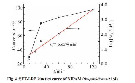從Fig.4可以看出,當(dāng)混合配體n(Me6TREN):n(PMDETA)=4:1時,轉(zhuǎn)化率隨反應(yīng)時間延長而增大,反應(yīng)時間為2h時,轉(zhuǎn)化率達到95%。