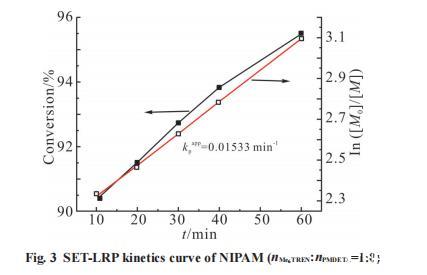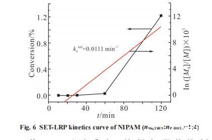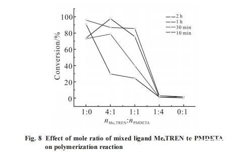 從Fig.7可以看出,這組與配體比例當(dāng)nMe TREN:nPMDETA 6 =1:4類似,轉(zhuǎn)化率極低,實驗現(xiàn)象也相同,說明在Me。TREN占比低于PMDETA時,混合配體的催化效率會明顯下降甚至不能催化聚合。