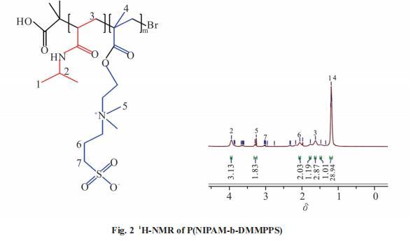 對P(NIPAM-b-DMMPPS)進行核磁表征,結(jié)果如Fig.2所示。δ1.19處的1峰屬于CCH3;δ3.97處的2峰屬于一CH2一。同樣,P(NIPAM-b-DMMPPS)中譜圖中也有對應(yīng)于PDMMPPS的特征峰:δ3.60~3.67,δ3.11,δ2.17,δ2.95處的峰分別代表PDMMPPS中一N+一CH2一,一N+一(CH3)2,一CH2一和一CH2一SO3一上的氫質(zhì)子峰。核磁結(jié)果表明了嵌段聚合物P(NIPAM-b-DMMPPS)的成功合成。