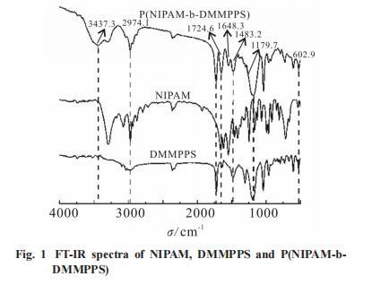 對單體NIPAM,DMMPPS及共聚物P(NIPAM-b-DMMPPS)進行紅外表征,結(jié)果如Fig.1所示。通過對比分析可以看出,P(NIPAM-b-DMMPPS)紅外譜圖中,3437cm-1為PNIPAM鏈段酰胺基中仲胺N-H的伸縮振動吸收峰,2974cm-1為飽和C-H伸縮振動吸收峰,1724cm-是PNIPAM鏈段中羰羰基C=O的伸縮振動吸收峰,1648cm-1的吸收峰為O-C=O的伸縮振動峰,1483cm-1為飽和一CH2一的伸縮振動峰,1179cm-1是PDMMPPS鏈段中S=O鍵的吸收峰,603 cm-1為C一Br的振動峰。紅外光譜結(jié)果分析表明,此共聚物由單體NIPAM,DMMPPS合成為預(yù)期的目標(biāo)產(chǎn)物。