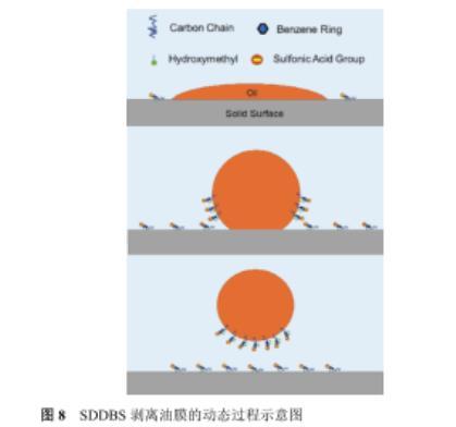 如圖8所示,SDDBS剝離油膜機理可從以下三個方面進(jìn)行闡釋,首先SDDBS吸附在油水界面上降低了油水界面張力;其次,SDDBS的二羥基通過氫鍵作用強化了其與巖石表面吸附,磺酸基團(tuán)富集于巖石表面使得巖石表面由親油轉(zhuǎn)變?yōu)閺娪H水,極大地增加了油滴在巖石表面接觸角,降低粘附功而使得油膜易于剝離;最后,由于SDDBS在油水界面和巖石表面同時吸附,增加剝離后油滴與巖石表面間的靜電斥力,使得剝離后油膜不易重新粘附壁面,實現(xiàn)高效剝離。