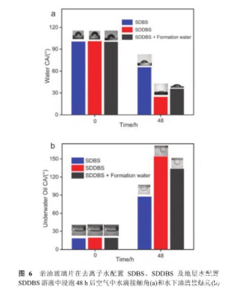 親油處理后玻璃片的空氣中水滴接觸角為100.2°,水下油滴接觸角為19.2°,為疏水親油性質(zhì).將親油玻璃片分別浸泡在0.02%(w)去離子水配置的SDBS、SDDBS溶液和地層水配置的SDDBS溶液中48 h,使用接觸角測量儀分別測量不同處理時間下其水滴接觸角及水下油滴接觸角.結(jié)果如圖6所示.SDDBS潤濕性調(diào)控能力較SDBS有較大提升,處理后空氣中水滴接觸角由65.1°降至24.5°,水下油滴接觸角由87.3°升至153.9°.經(jīng)SDDBS處理后的玻璃片呈現(xiàn)親水/水下強疏油性質(zhì).為探究鹽對界面潤濕調(diào)控性能的影響,使用地層水配置的SDDBS溶液處理親油玻璃片,結(jié)果表明處理后空氣中水滴接觸角為35.6°,水下油滴接觸角為133.6°,說明地層水的引入降低了SDDBS對親油表面的親水疏油調(diào)控效果.這是由于地層礦化度條件下,SDDBS分子鏈團(tuán)聚影響界面吸附,導(dǎo)致潤濕調(diào)控能力略有下降.