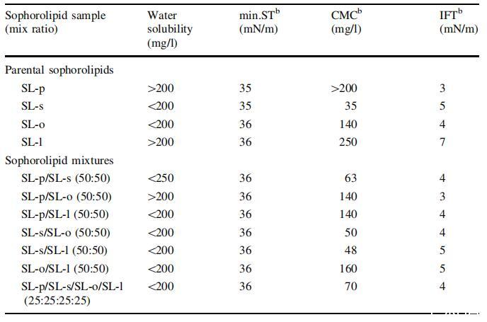4個親代SLs中的每一個都產(chǎn)生了35–36 mN/m的可比最小ST,但CMC值明顯不同(表3)。 SL-p和SL-l的CMC值均大于200 mg/l,而SL-s和SL-o的CMC值分別為35 mg/l和140 mg/l。 IFT值范圍為3 mN/m(SL-p)至7 mN/m(SL-l)。 為了控制SLs的表面活性,以50:50的混合比制備混合物,并重新評估其性能。 各混合物的內(nèi)酯分布見表2。 經(jīng)分析,最小ST和IFT相對不變,但CMC值確實因SL混合物而異。 通過混合獲得了介于48 mg/l和140 mg/l之間的臨界膠束濃度。 有趣的是,CMC值最低的SL混合物都含有SL-s成分。 特別是SL-s的CMC值為35 mg/l; 即使是以25:25:25:25的比例包含所有4種親本SL的混合物,其CMC值(70 mg/l)也比不含SL-s成分的其他混合物低。 這些數(shù)據(jù)表明,SL-s對水的表面活性性能的影響更為顯著。 通過使用較少的SL-s,可以實現(xiàn)相等的最小ST和IFT。 性能控制和高產(chǎn)量將通過降低成本最終有助于SLs的工業(yè)應(yīng)用。 這些數(shù)據(jù)還指出,通過將不同的SLs混合在一起以獲得所需的性質(zhì),可以在一定程度上控制SLs的表面活性性質(zhì)。 雖然未達到表明這些SLs單獨具有優(yōu)越表面活性劑性能的最低標準,但其性能可能足以允許其作為石化表面活性劑添加劑的使用量增加,以便在大量使用表面活性劑的應(yīng)用中盡量減少不利的環(huán)境影響。 SL-p和SL-l的CMC值均大于200 mg/l,而SL-s和SL-o的CMC值分別為35 mg/l和140 mg/l。IFT值范圍為3 mN/m(SL-p)至7 mN/m(SL-l)。為了控制SLs的表面活性,以50:50的混合比制備混合物,并重新評估其性能。各混合物的內(nèi)酯分布見表2。經(jīng)分析,最小ST和IFT相對不變,但CMC值確實因SL混合物而異。通過混合獲得了介于48 mg/l和140 mg/l之間的臨界膠束濃度。有趣的是,CMC值最低的SL混合物都含有SL-s成分。特別是SL-s的CMC值為35 mg/l;通過將SL-s與SL-p、SL-o和SL-l以50:50的比例混合,CMC值分別增加到63 mg/l、50 mg/l和48 mg/l。即使是以25:25:25:25的比例包含所有4種親本SL的混合物,其CMC值(70 mg/l)也比不含SL-s成分的其他混合物低。這些數(shù)據(jù)表明,SL-s對水的表面活性性能的影響更為顯著。通過使用較少的SL-s,可以實現(xiàn)相等的最小ST和IFT。性能控制和高產(chǎn)量將通過降低成本最終有助于SLs的工業(yè)應(yīng)用。這些數(shù)據(jù)還指出,通過將不同的SLs混合在一起以獲得所需的性質(zhì),可以在一定程度上控制SLs的表面活性性質(zhì)。雖然未達到表明這些SLs單獨具有優(yōu)越表面活性劑性能的最低標準,但其性能可能足以允許其作為石化表面活性劑添加劑的使用量增加,以便在大量使用表面活性劑的應(yīng)用中盡量減少不利的環(huán)境影響。