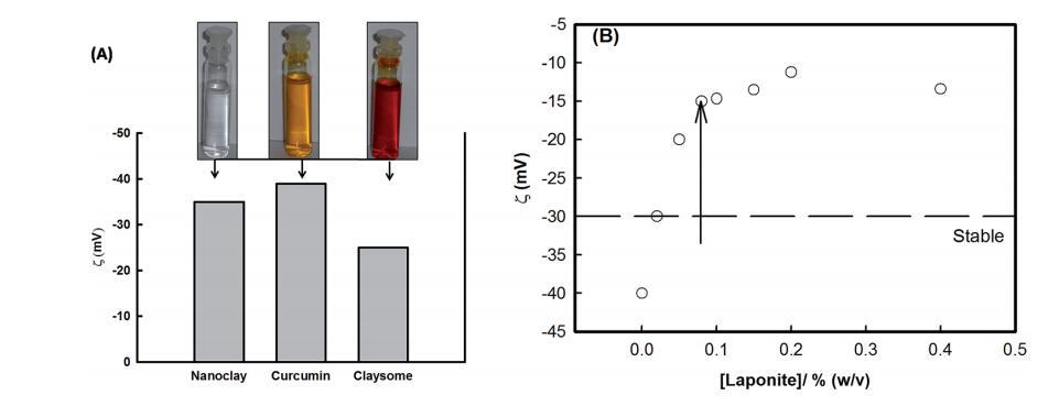 使用電泳法測量核殼姜黃素納米顆粒表面的靜電電位(zeta電位)(圖3(A))。值得注意的是,姜黃素和納米粘土均受臨界平衡斥力的控制,而不考慮姜黃素和納米粘土在界面處具有相同極性(負(fù))的zeta電位。關(guān)于復(fù)雜系統(tǒng)中負(fù)責(zé)穩(wěn)定性的不同力的更多細(xì)節(jié)將在后面的章節(jié)中進(jìn)行理論討論。此外,還測量了分散體的zeta電位,作為室溫下納米粘土濃度的函數(shù)。該電位隨著系統(tǒng)中納米粘土濃度的增加而增加(圖3(B))。最初,當(dāng)納米粘土濃度較低時(shí),電暈較薄,這有利于形成穩(wěn)定的粘粒組裝體,這進(jìn)一步得到較高zeta電位值的支持。隨著納米粘土濃度的增加,電暈尺寸增加(>100nm),zeta電位也發(fā)生了同樣的情況,這反過來又在復(fù)雜系統(tǒng)中產(chǎn)生了不穩(wěn)定性。