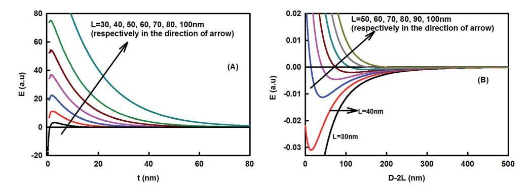 圖5納米粘土簇的長度對粘土小體組裝的影響。(A) 作為界面區(qū)域厚度函數(shù)的能量變化(s?60 nm;T?298 K,f?0.5;姜黃素納米顆粒半徑R?50 nm,疏水衰減長度x0?1 nm,界面張力?40 mN m-1)。(B) 粘粒–粘粒相互作用作為粒間分離D的函數(shù),使用方程(5)計(jì)算。當(dāng)存在大的納米粘土團(tuán)簇時(shí),能量最小值的深度減小,當(dāng)L>80nm時(shí),能量變得完全排斥。