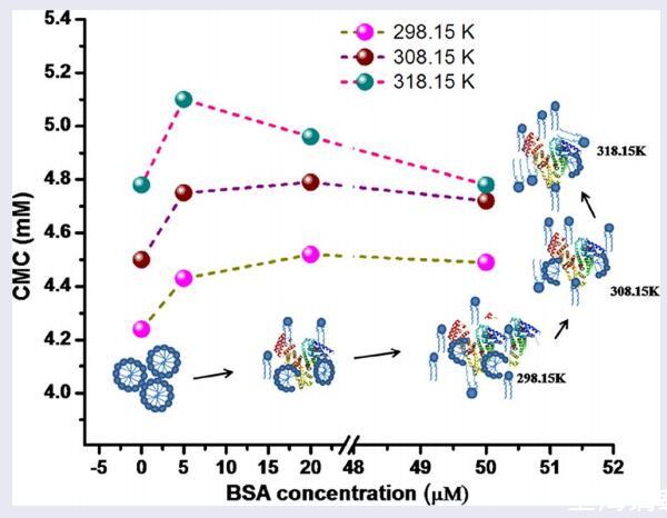 用表面張力法研究了牛血清白蛋白對(duì)IL型gemini表面活性劑[C10-4-C10im]Br2表面性質(zhì)的影響。研究了不同溫度下臨界膠束濃度(CMC)與BSA濃度的關(guān)系。[C10-4-C10im]Br2的CMC隨著BSA濃度的增加以及系統(tǒng)溫度的升高而增加。界面參數(shù),即;計(jì)算了最大表面過量濃度(Γmax)、每分子最小面積(Amin)和CMC下的表面壓力(ΔCMC)。此外,利用表面張力數(shù)據(jù)評(píng)估了吸附和膠束化的熱力學(xué)參數(shù)。結(jié)果表明,[C10-4-C10im]Br2與BSA的結(jié)合是自發(fā)的、放熱的。該過程是熵驅(qū)動(dòng)的,疏水相互作用是主要驅(qū)動(dòng)力。