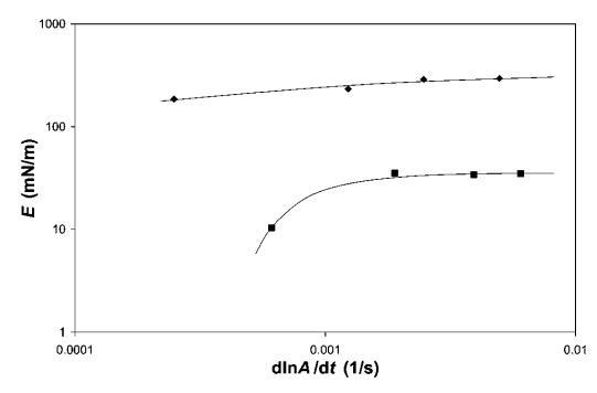 頻率依賴性。 為了評(píng)估其中一些系統(tǒng)中粘性損失的重要性,我們對(duì)b-lg和HFBII進(jìn)行了頻率相關(guān)的表面膨脹流變。 對(duì)于表面膨脹流變學(xué),我們顯示了在18<P<22 mN m-1之間測(cè)量的小變形模量(見圖10)。 注意,變形率d(lna)/dt為0.0012 s 1對(duì)應(yīng)于5 mm min 1的勢(shì)壘速度,用于大變形實(shí)驗(yàn)。 相比之下,歧化時(shí)間約為0.5小時(shí),接近泡沫實(shí)驗(yàn)觀察到的粗化時(shí)間。 HFBII的數(shù)據(jù)表明,在所研究的變形速率范圍內(nèi),變形速率對(duì)E的影響適中。 對(duì)于b-乳球蛋白,頻率的影響更為明顯,因此,在變形速率低于0.001 s 1時(shí),可觀察到E的強(qiáng)烈下降。 這表明b-lg的粘性損失比HFBII更為明顯。 這一比較再次表明,b-lg的外觀更柔軟,壓縮/膨脹時(shí)解吸/吸附能力更強(qiáng)。