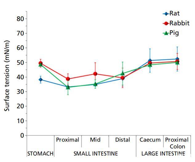 大鼠、兔和豬的胃腸液在整個(gè)腸道的表面張力明顯低于水的表面張力。這些動(dòng)物的表面張力遵循一般模式,胃的表面張力較高,小腸的表面張力較低,而遠(yuǎn)端腸道的表面張力再次升高(圖3,表1)。這種表面張力的行為也與腸道內(nèi)的消化過程相一致。小腸環(huán)境中的消化營養(yǎng)物(如葡萄糖、氨基酸、脂肪酸)和消化分泌物(如膽汁)降低了該區(qū)域液體的表面張力,然后在遠(yuǎn)端腸道中重新吸收,從而產(chǎn)生更高的表面張力。