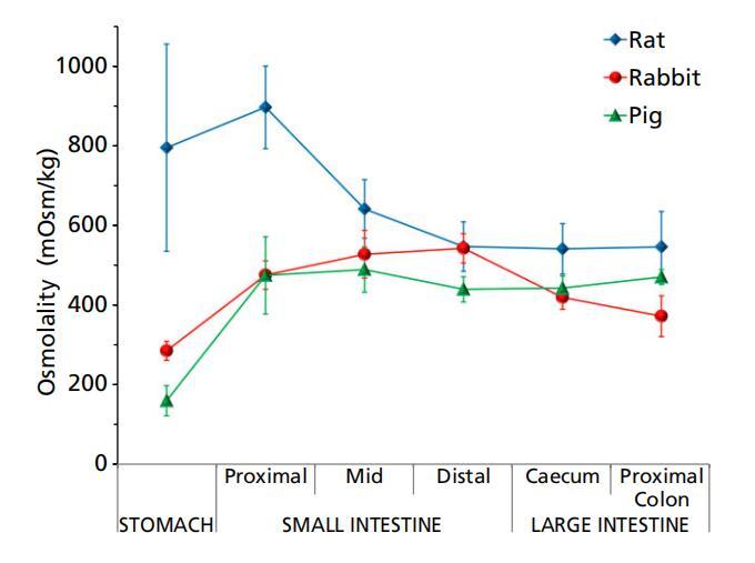 三種動(dòng)物模型的胃腸內(nèi)容物的滲透壓通常遵循相同的趨勢(shì),胃低,近端小腸增加,遠(yuǎn)端減少。豬似乎沿著這種模式一直到盲腸,在結(jié)腸處進(jìn)一步輕微增加(圖2)。然而,在大鼠中,由于胃滲透壓的高度可變性,胃內(nèi)容物的滲透壓與近端和中端小腸的滲透壓沒有統(tǒng)計(jì)學(xué)差異。這種滲透壓模式通常與消化系統(tǒng)的生理學(xué)相一致,在消化系統(tǒng)中,大多數(shù)食物在小腸中被消化并分解為葡萄糖、氨基酸和脂肪酸等組成成分,因此液體的滲透壓較高。隨著營養(yǎng)被腸道進(jìn)一步吸收,內(nèi)容物的滲透壓降低。