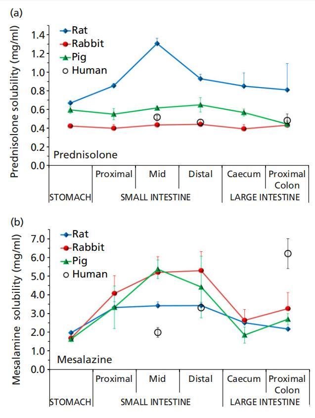 圖4(a)潑尼松龍和(b)美沙拉秦在大鼠(8只大鼠)、兔子(n=6)和豬(n=3)胃腸液(上清液)中的溶解度,F(xiàn)adda等人的人類數(shù)據(jù)。[11]