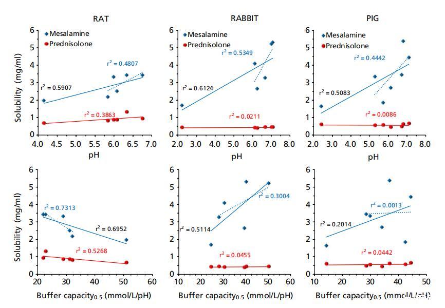 潑尼松龍的水溶性為0.223mg/ml;[11] 該值低于這些調(diào)查中觀察到的值(表1)。潑尼松龍的溶解度是合理恒定的,與豬和兔腸道樣本的位置無關(guān),并且更接近于之前測(cè)量的人類空腸、回腸和結(jié)腸液體中的溶解度[11](圖4)。然而,從胃到小腸中部,潑尼松龍?jiān)诖笫篌w內(nèi)的溶解度呈上升趨勢(shì),此后,在遠(yuǎn)端小腸中的溶解度下降,但在腸道下方?jīng)]有明顯變化。強(qiáng)的松在大鼠腸道液體中的溶解度通常高于人類,但在近端結(jié)腸除外,因?yàn)榻私Y(jié)腸的變異性更高,所以差異沒有達(dá)到統(tǒng)計(jì)學(xué)意義。與大鼠胃液相比,大鼠近端腸道的特殊溶解行為可能是由于近端和中段小腸的表面張力相對(duì)較低(表1)。由于潑尼松龍是一種可結(jié)合的化合物,其溶解度預(yù)計(jì)與pH無關(guān);這與我們的研究結(jié)果是一致的。在任何受試動(dòng)物物種中,潑尼松龍溶解度與緩沖容量、滲透壓或表面張力之間也沒有顯著關(guān)系(圖5)。