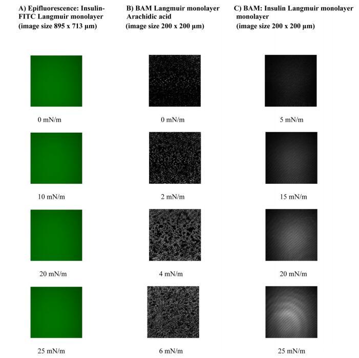 3.4. 人胰島素朗繆爾單層的表觀熒光和布魯斯特角顯微鏡觀察。 人胰島素Langmuir單層的形貌通過FITC人胰島素的表觀熒光進行檢查,而布魯斯特角顯微鏡用于2-D純?nèi)艘葝u素。由于胰島素是非熒光的,因此必須附加熒光團才能使用表觀熒光顯微鏡。 蛋白質(zhì)常用的探針是異硫氰酸熒光素(FITC)。