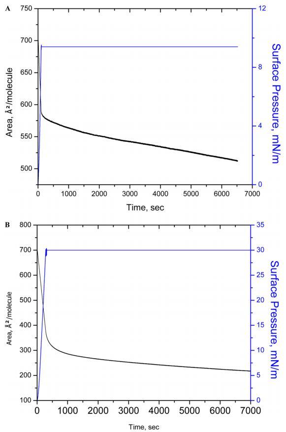圖3.在亞相pH值5.6下,在表面壓力為10(A)和30 mN/m(B)的條件下,對人胰島素Langmuir單層膜進行90 min的穩(wěn)定性測量。