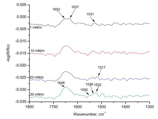 圖7顯示了HI-Langmuir單層在不同表面壓力下60°時的p極化。 這條帶子在1517厘米處 ? 1對應于α-螺旋。 在1 mN/m的表面壓力下,有兩個可見帶:1652和1637 cm ? 1. 隨著表面壓力的增加,這兩個譜帶重疊并成為一個寬帶。 在30百萬米 ? 1,波段可視為單個波段,頻率為1648厘米 ? 1. 這是對應于α-螺旋的酰胺II區(qū)域的條帶。 下一個波段在1531厘米處以1 mN/m的寬帶出現(xiàn) ? 1. 隨著表面壓力的增加,它分成三個帶:1550、1536和1522厘米 ? 1. 在1550和1522厘米處的頻帶 ? 1分別對應于α-螺旋和β-折疊中的酰胺II區(qū)域。 這種譜帶分裂表明,譜帶位于1531厘米處 ? 在較低的表面壓力下,1由α-螺旋和β-片組成。 在較高的表面壓力下,譜帶分離為離散的單個峰。 光譜中出現(xiàn)的其他峰是由于氨基酸和烷烴鏈的存在。 這條帶子長1448厘米 ? 1對應于C ? H CH2和CH3的剪切。 HI-Langmuir單分子膜的p-極化輻照度中存在所有三個表明α-螺旋的主譜帶。