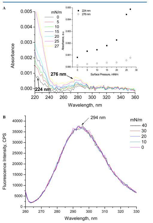 圖5.(A) 紫外線 ? 亞相pH值為5.6時人胰島素Langmuir的可見光譜。 插圖顯示了224和276 nm處吸光度隨表面壓力的變化。 (B) 亞相pH 5.6下人胰島素朗繆爾的熒光光譜(λ激發(fā)=270 nm,激發(fā)和發(fā)射時的狹縫寬度分別為5和5 nm)。