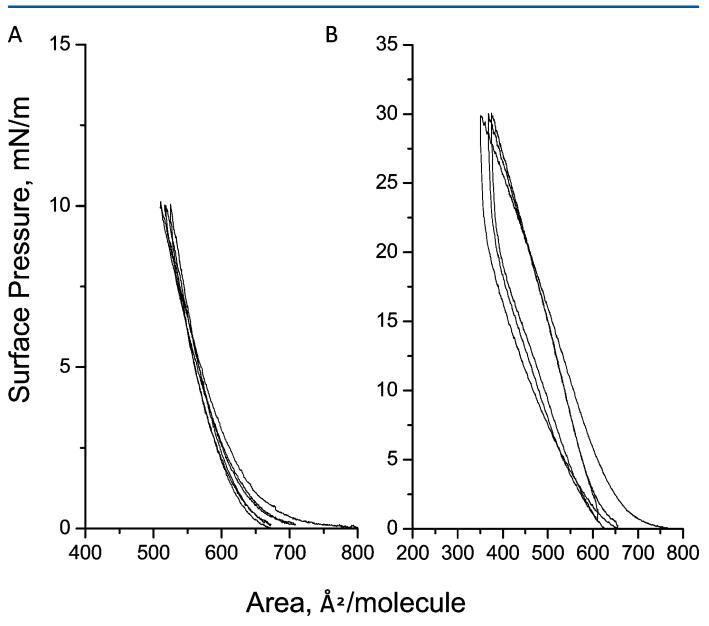 圖2.三個壓縮 ? 在亞相pH值5.6下,減壓循環(huán)達到10(a)和30 mN/m(B)的人胰島素Langmuir單層表面壓力。