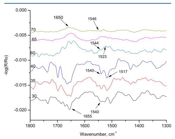 圖8顯示了HI-Langmuir單層在10 mN m處的p極化 ? 1在30、35、40、60、65和70°的六個不同角度。 在布儒斯特角之前,30、35和40 mN/m處的角未顯示出β片的特征帶。 所有三個角度顯示1655和1540厘米處的條紋 ? 1分別對應于酰胺I和酰胺II吸收。 這條帶子在1517厘米處 ? 1,對應于α-螺旋,在35°和40°中存在。 在布儒斯特角之后,所有60、65和70°的三個角都顯示出介于1650和1655之間的帶,這對應于α-螺旋中的酰胺I吸收。 當角度為60°時,在1523 cm處可以看到峰值 ? 1,對應于β片。 光譜中的其他譜帶都不是α-螺旋或β-片的特征。 光譜表明HI在空氣中以α-螺旋的形式存在 ? 水界面。 在10 mN m的恒定壓力下,隨著角度的增加 ? 1,發(fā)現(xiàn)光譜中的α-螺旋特征減少。
