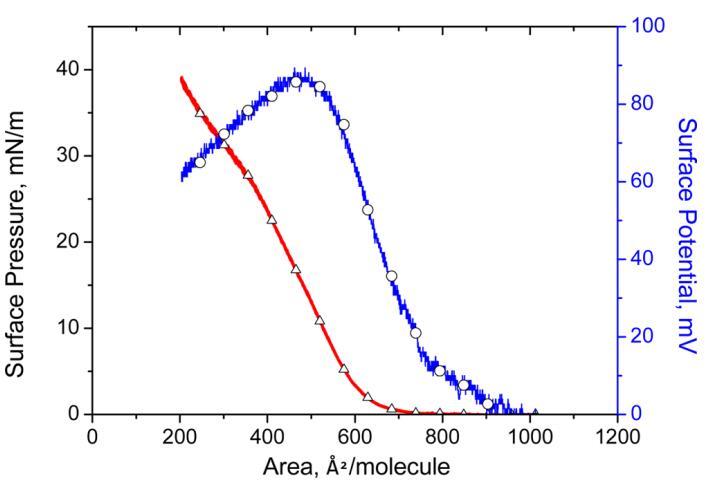 圖1。 表面壓力( △) 表面電位 ? 區(qū)域( ○) 亞相pH值5.6時人胰島素Langmuir單層的等溫線。