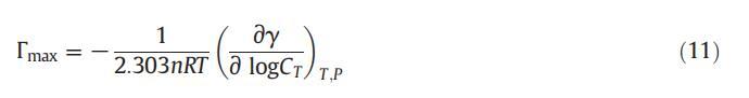 借助吉布斯吸附方程,我們可以使用公式(11)[62]計(jì)算表面活性劑在空氣-溶液界面的最大吸附量: