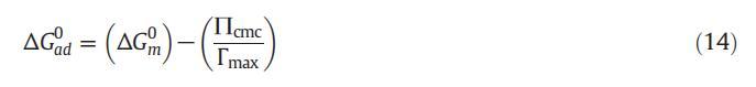 式(14)中的術(shù)語(yǔ)e∏cmcΓmaxT為我們提供了將單層表面壓力為零的兩親分子引入膠束所需的工作信息。ΔGm0和ΔGad 0的值均為負(fù)值,表明這兩個(gè)過程都是有利的,但是ΔGad 0的值比ΔGm0的值更為負(fù),這表明所有這些系統(tǒng)的吸附過程比膠束形成過程更為有利。