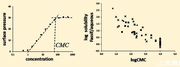 表面張力由一種成熟的體外測定法測定,該測定法通過測量化合物的臨界膠束濃度和兩親性來評估化合物的表面活性劑性質(zhì)。 兩親性是用于量化化合物與生物膜親和力的一個關(guān)鍵屬性,在制藥工業(yè)中廣泛用于預(yù)測藥物誘導(dǎo)的磷脂病,11,12 ? 腦屏障滲透,13和藥物淋巴吸收。 14在這項工作中,我們同樣評估了化合物對生物相關(guān)介質(zhì)中所含膠束的親和力是否可以用化合物固有的表面活性劑性質(zhì)來解釋。 因此,我們對不同化合物的表面活性劑性質(zhì)進(jìn)行了表征,以將此類表面活性性質(zhì)與FaSSIF中觀察到的與水介質(zhì)溶解度相比的溶解度增強(qiáng)程度相關(guān)聯(lián)。 共分析了51個分子,包括上市藥物和羅氏專利化合物,具有廣泛的溶解性、親脂性和電離狀態(tài)。