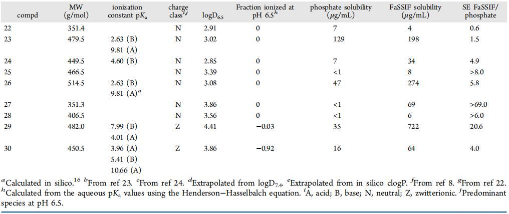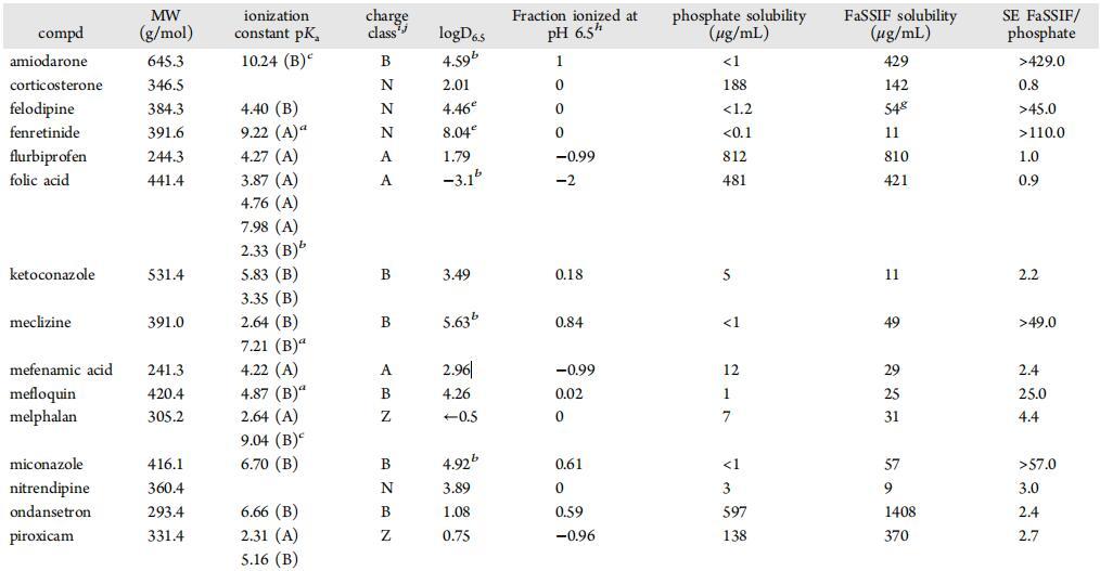 在FaSSIF和水性緩沖液中的溶解度評估和物理化學(xué)特性。選擇了一組21種上市藥物和30種來自不同研究項(xiàng)目的羅氏化合物,因?yàn)樗鼈冊趐H值為6.5的水性緩沖液和FaSSIF介質(zhì)中的溶解度不同。作為標(biāo)準(zhǔn)做法,所有溶解度和表面壓力剖面測量均在室溫下進(jìn)行,而不是在37°C下進(jìn)行。盡管溫度可能會影響藥物溶解度、脂質(zhì)聚集體分配和溶解,據(jù)報(bào)道,?;悄懰崮z束的聚集數(shù)對溫度變化相對不敏感。19該化合物組包含不同的化學(xué)性質(zhì)、廣泛的親脂性,并涵蓋不同類型和程度的電荷狀態(tài),包括中性、酸性、堿性和兩性離子分子。表1列出了主要理化性質(zhì)和溶解度數(shù)據(jù)。
