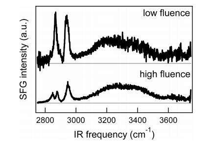 高密度下不同的SFG光譜是激光注量的函數(shù)。通過(guò)比較在不同通量下測(cè)得的高壓(高脂密度)下脂層的兩個(gè)SFG光譜(圖7),在CH峰處觀察到差異,而水帶大致相同。在相對(duì)較高的通量下(底部面板)~10 mJ/cm2,CH2峰值為2850 cm?1仍然清晰可見(jiàn),而該峰值在低通量的頂部面板中不存在(~1.5 mJ/cm2)。此外,在高通量譜中,CH3峰的強(qiáng)度(2880和2950 cm?1)與低通量測(cè)量相比,相對(duì)于水而言,低通量測(cè)量。這兩個(gè)觀察結(jié)果清楚地表明,在高通量條件下,單層膜受到激光的影響:由于熱,尾部更加無(wú)序,導(dǎo)致更多的凹凸不平的缺陷,因此存在CH2峰和CH3信號(hào)減弱。顯然,激光的重復(fù)激發(fā)導(dǎo)致了從具有有序尾的凝膠狀態(tài)到具有較少有序尾的液晶狀態(tài)的相變。30,因?yàn)閷?shí)驗(yàn)是在室溫下進(jìn)行的(~23°C),相變溫度為41°C,30我們可以得出結(jié)論,在高通量情況下,樣品的穩(wěn)態(tài)加熱至少為18°C,考慮到基于焦點(diǎn)尺寸和紅外光穿透深度(見(jiàn)附錄)估計(jì)的單發(fā)溫升在2到19°C之間(取決于紅外頻率),這并非不合理。對(duì)于低通量情況(頂部面板),穩(wěn)態(tài)溫升不超過(guò)18°C,因?yàn)槲覀內(nèi)匀豢梢钥吹接行虻奈膊?,通過(guò)停止槽的旋轉(zhuǎn)指示凝膠狀態(tài)。