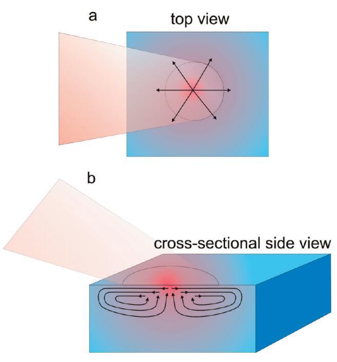 圖4。水樣近表面區(qū)域穩(wěn)態(tài)加熱引起的流動(dòng)示意圖。溫度示意圖上用顏色表示,其中紅色表示熱,藍(lán)色表示冷。橙色陰影區(qū)域顯示入射到表面的激光束,箭頭表示溫度梯度誘導(dǎo)流動(dòng)的方向。(a)俯視圖,顯示近表面區(qū)域的徑向位移,(b)橫截面?zhèn)纫晥D,顯示產(chǎn)生的Marangoni流動(dòng)單元。請(qǐng)注意,在焦點(diǎn)的中心,水流向上,因此表面可以有效地持續(xù)更新。
