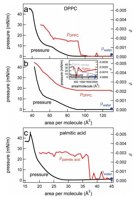 圖8。(a)在制備單分子層后,通過(guò)快速添加DPPC溶液持續(xù)壓縮單分子層,直到達(dá)到130?2的每分子面積,水上DPPC的表面壓力(黑色,左軸)和橢圓系數(shù)(紅色,右軸)。(b)水上DPPC的表面壓力(黑色,左軸)和橢圓系數(shù)(紅色,右軸)是每個(gè)分子面積的函數(shù)。通過(guò)逐滴添加更多DPPC,每次滴加間隔幾分鐘,改變了該區(qū)域。以這種方式達(dá)到的每個(gè)分子的最小面積為2000?2。插圖顯示了橢圓度系數(shù)(對(duì)于一個(gè)特定實(shí)驗(yàn)(紅色)和三個(gè)實(shí)驗(yàn)的平均值(灰色))以及非常低密度下的壓力。(c)在制備單分子層后,通過(guò)快速添加棕櫚酸溶液,直到達(dá)到每分子45?2的面積,連續(xù)壓縮單分子層期間,水上棕櫚酸的表面壓力(黑色,左軸)和橢圓系數(shù)(紅色,右軸)。在噴灑表面活性劑之前測(cè)量的純水橢圓度在每個(gè)面板中以藍(lán)色圓點(diǎn)表示。