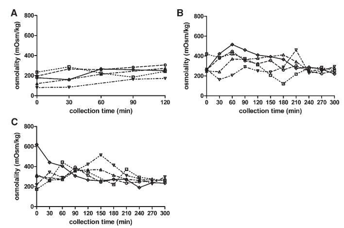圖5。在禁食(A)、喂食(B)和富含脂肪的喂食(C)狀態(tài)HIF中,滲透壓(mOsm/kg)隨餐后給藥時(shí)間的變化。(--?--)主題1(··?··)主題2,(·–·)△·–·)主題3,(·-·▽·–·)主題4,(-◇–)科目5。