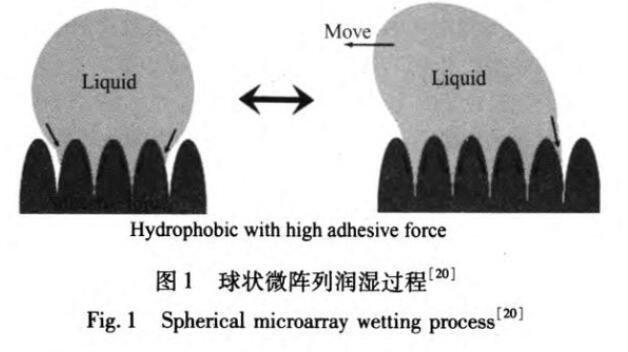 有評(píng)論說(shuō)疏水高粘附的界面也會(huì)存在,然而這是具有特殊微納米結(jié)構(gòu)的表面,比如玫瑰花瓣等,這類的界面對(duì)微結(jié)構(gòu)的幾何性質(zhì)要求較高。而通常的情形下,微納米結(jié)構(gòu)的存在會(huì)使疏水的界面出現(xiàn)超疏水的現(xiàn)象,其粘附力會(huì)更低,比如荷葉的表面。如下圖中,上面的是疏水高粘附,下面是疏水低粘附的界面,然而這時(shí)由水與界面的接觸面積決定的,接觸面積越大,其粘附力越大,否則會(huì)越小。這是在化學(xué)性質(zhì)相同時(shí),從微結(jié)構(gòu)的角度考慮的粘附力。這種疏水高粘附是與平整的高粘附界面相互比較來(lái)說(shuō)的,然而其是否一定比親水的物質(zhì)粘附力大未曾可知。
